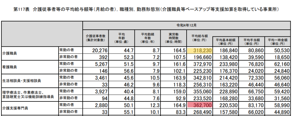 厚生労働省がとりまとめた、「令和4年度介護従事者処遇状況等調査結果」によると、